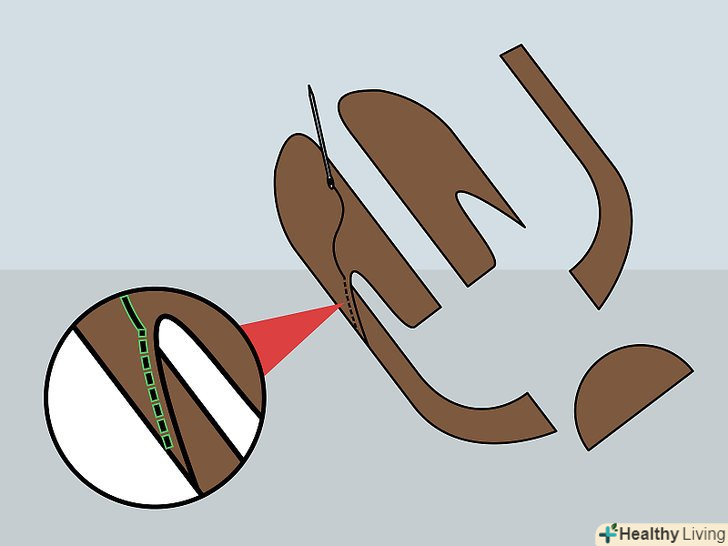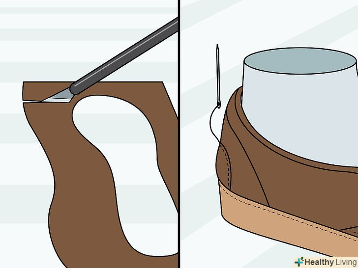 Зшийте частини між собою. [3] рівний шов - одна з найскладніших завдань в пошитті взуття. Будьте обережні і не поспішайте. Зшити шкіру швидше буде простіше, проте погані шви будуть кидатися в очі, і взуття буде виглядати неакуратно. Намагайтеся шити якомога ближче до краю тканини. Якщо матеріал буде нашаровуватися, у вас з'являться непотрібні виступи. Якщо ви спеціально вирізали трохи більше матеріалу, щоб залишити місце на шов, врахуйте це, коли будете зшивати частини. Ви ж не хочете, щоб у вас вийшов черевик, який занадто великий або занадто малий для підошви.- Як правило, зшивати тканину просто, чого не скажеш про шкіру. Шкіра-щільний матеріал, і зшити її з легкістю у вас не вийде. Краще спочатку проколоти отвори, а потім протягнути через них нитку.