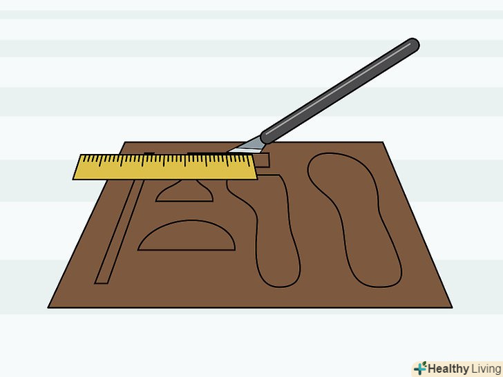 Розріжте тканину і шкіру. за допомогою готового шаблону або власного малюнка виріжте всі необхідні частини черевика гострим ножем або скальпелем. Можливо, Вам стане в нагоді лінійка і транспортир, щоб всі лінії розрізів вийшли рівними.- Вирізаючи ділянку, залишайте як мінімум два з половиною сантиметри матеріалу знизу черевика, а також по сантиметру там, де частини будуть з'єднуватися один з одним. Це називається відступом на шви.