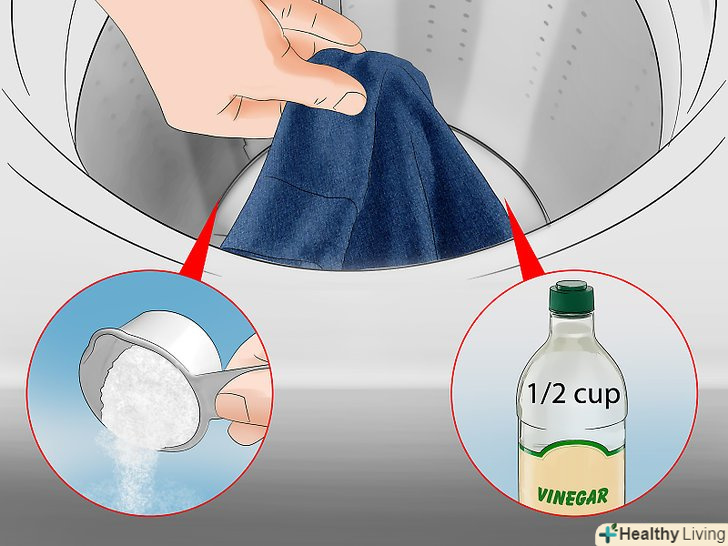 Додайте в пральну машину джинси, миючий засіб і оцет. покладіть в пральну машину джинси і звичайний пральний порошок. Потім відміряйте півсклянки (120 мл) білого оцту і налийте в спеціальний відсік пральної машини. Оцет допоможе вивести з джинсів залишки жиру. [8]