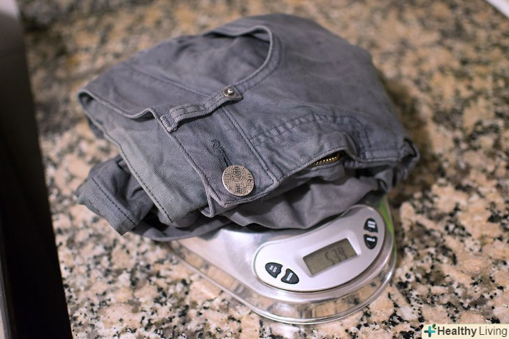 Зважте джинси. щоб зрозуміти, скільки фарби вам знадобиться, необхідно дізнатися, скільки важать джинси. Зважте їх на вагах і ознайомтеся з інструкцією до фарби, щоб з'ясувати, в якому обсязі буде необхідно її використовувати. [9]- У більшості випадків джинси важать близько 500 г.