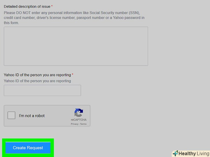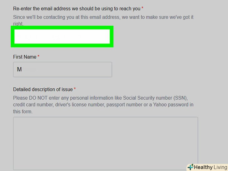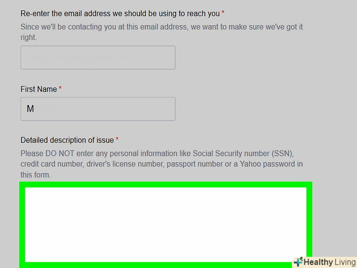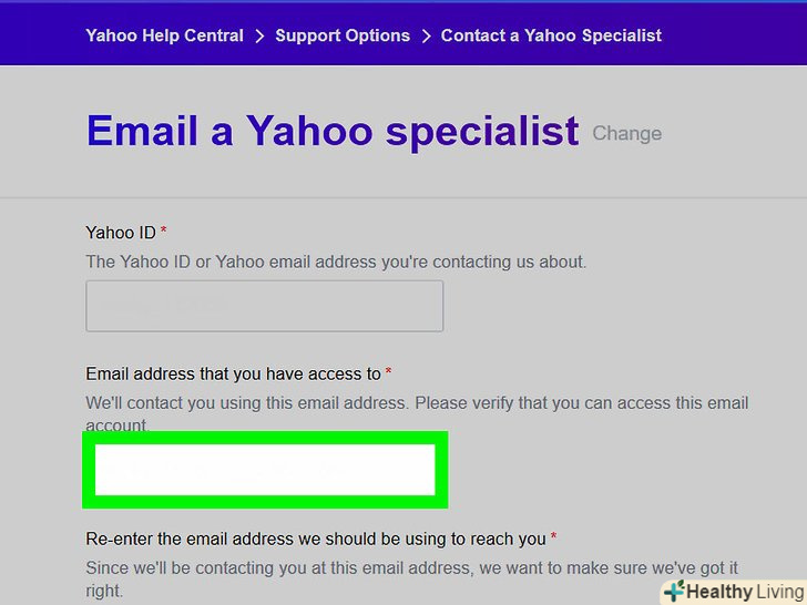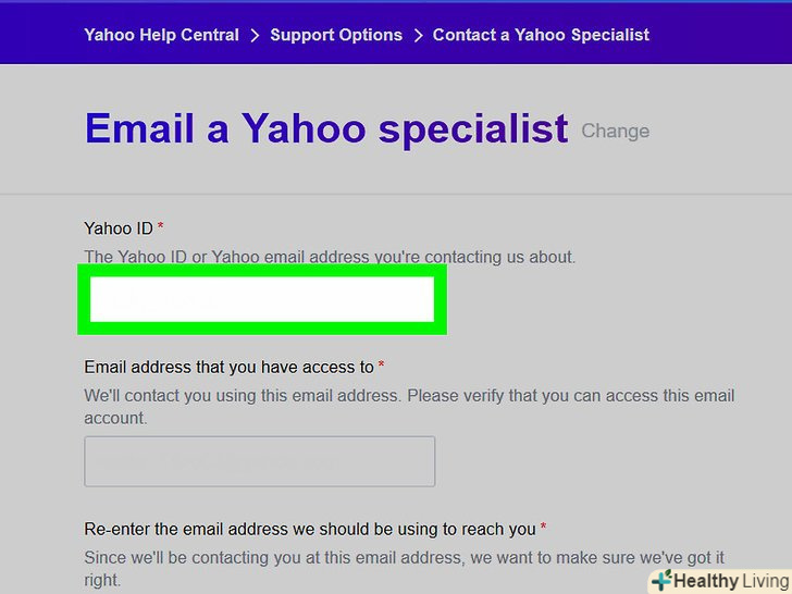 Відкрийте сторінкуEmail a Specialist (написати фахівцеві).на цій сторінці можна повідомити про проблеми з обліковим записом Yahoo. За допомогою цієї сторінки можна безпосередньо зв'язатися зі службами Yahoo.[1]