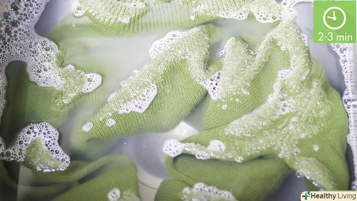 Залиште Светр у воді на 2-3 хвилини. потім дістаньте його з миски і не викручуйте, вода повинна просто стікати.- Злийте брудну воду і налийте чисту, щоб прополоскати светр. Міняйте воду і полощіть светр до тих пір, поки не вимиється все мило, а вода не стане прозорою. Можливо, що вам доведеться повторити ополіскування 10-12 разів. [2]