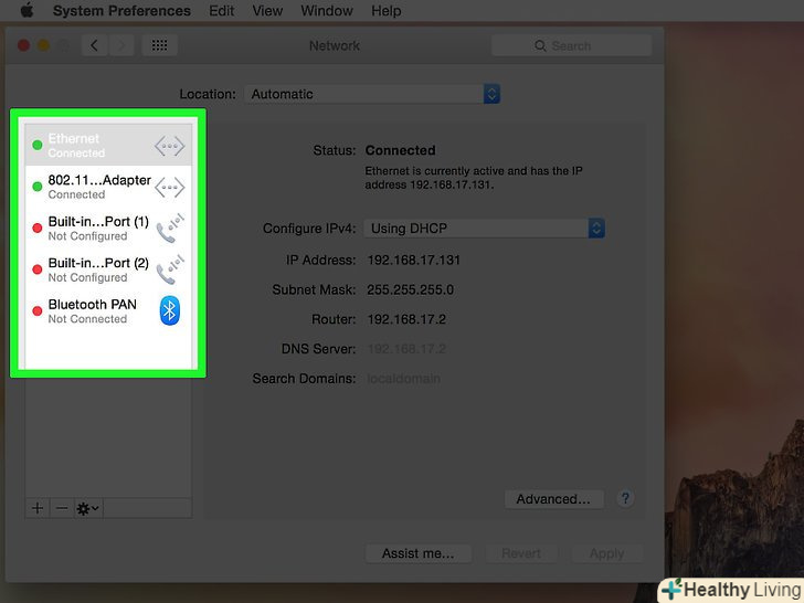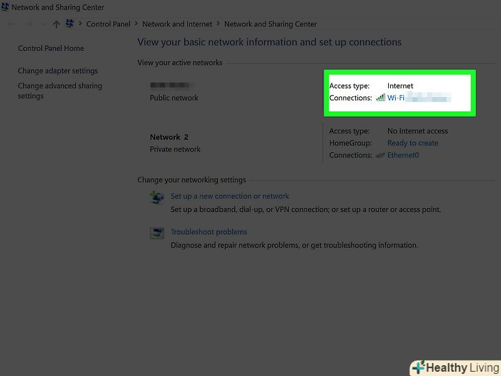 Виберіть активне з'єднання на лівій панелі. воно позначено зеленим значком, а під ним ви побачите»підключено".- Переконайтеся, що ви підключені до мережі маршрутизатора.