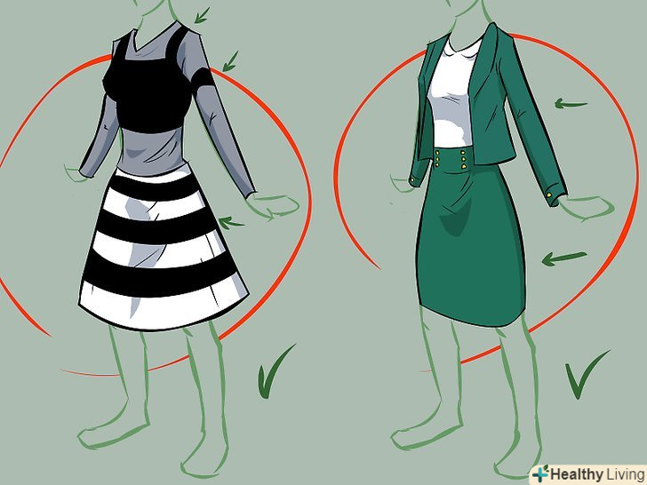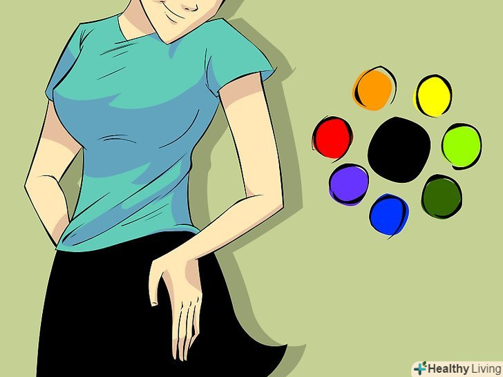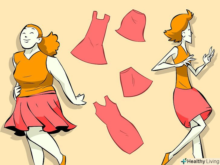 - Зверніть увагу на те, які кольори і орнаменти на тканині підкреслюють ваш тип фігури (помітні орнаменти виділяють лінії тіла, тому їх розміщення має важливе значення). Наприклад, якщо ви хочете приховати стегна, темні кольори в нижній частині наряду підійдуть найкраще, а для верхньої частини ви можете вибрати одяг помітних кольорів. Колір морської хвилі, сірий, темно-коричневий або чорний стрункішою; більш яскраві кольори візуально збільшують частини тіла.