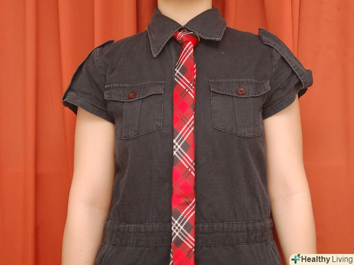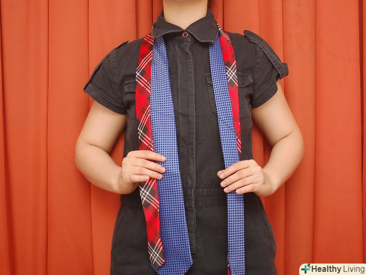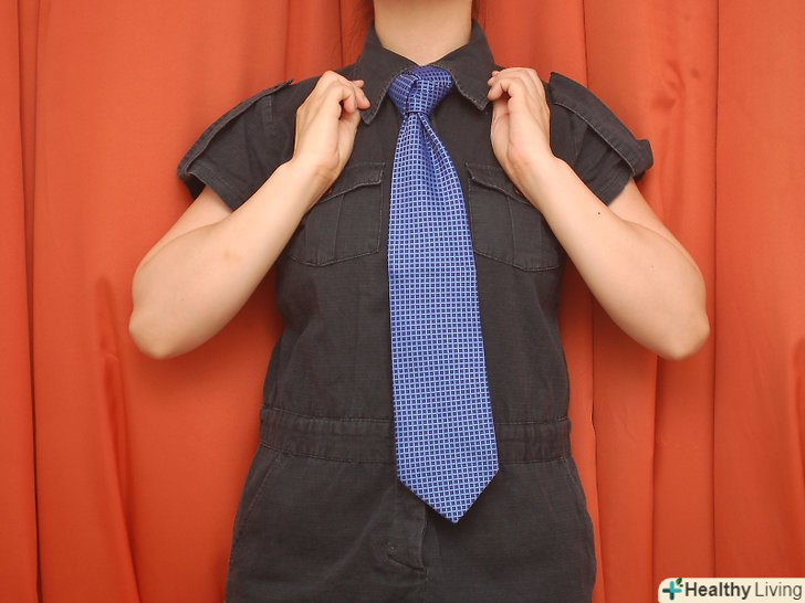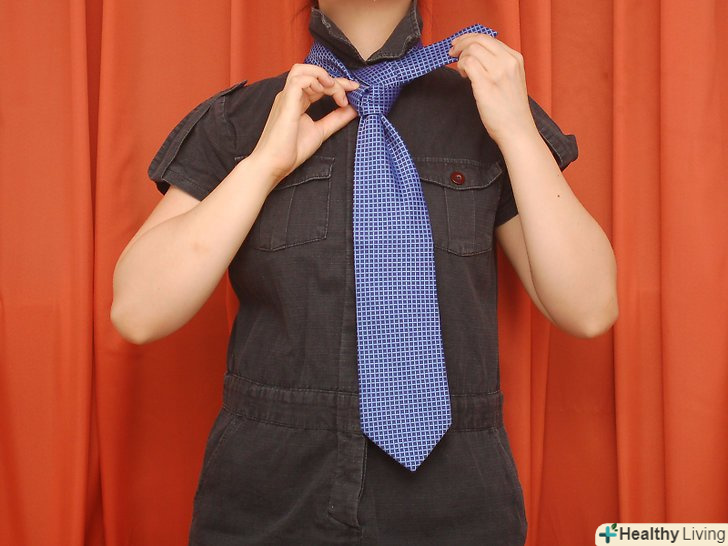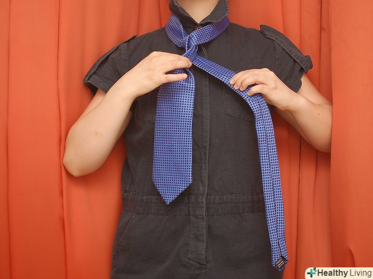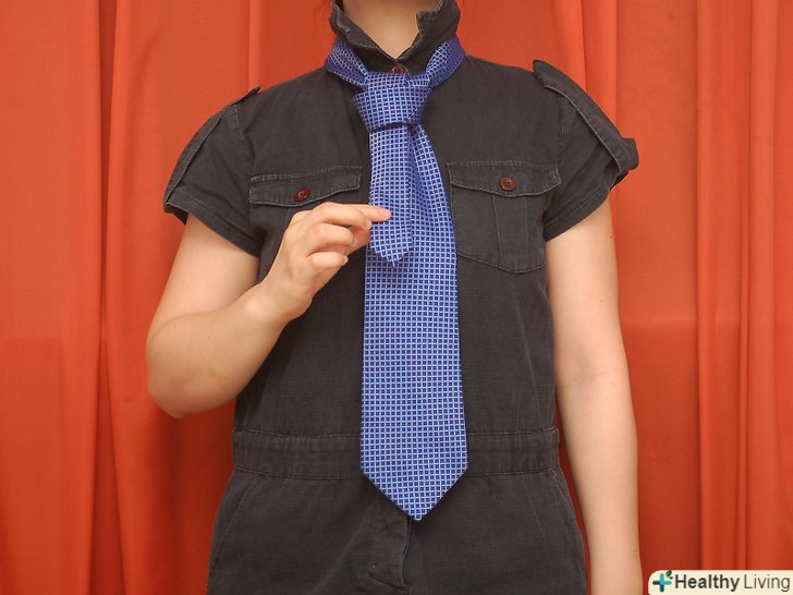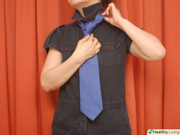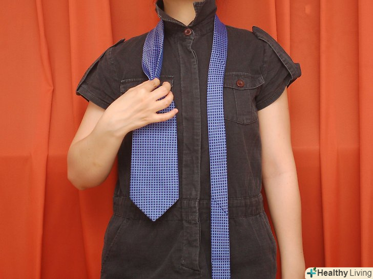 Обв'яжіть краватку навколо шиї. [1] товстий (широкий) кінець краватки повинен бути десь на 2,5 сантиметра нижче вашої талії або пупка. Тонкий кінець буде звисати уздовж тіла нижче ніж товстий кінець.- Вузол "Трініті" вважається екзотичним вузлом або вузлом для особливих випадків, але насправді він досить простий. Кроки для зав'язки вузла мабуть, звичайні і легкі. Це все одно що зав'язати звичайний вузол, але з великою кількістю кроків.