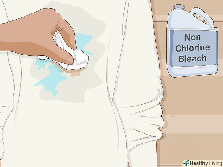 Використовуйте більш м'який безхлорний відбілювач в тих випадках, коли неможливо використовувати хлорний. цей вид відбілювача впливає на одяг за допомогою кисню або пероксиду водню, що набагато безпечніше. OxyClean, Clorox 2 і деякі інші марки не включають хлор до складу своїх продуктів. Ось спосіб застосування таких відбілювачів:- Перевірте ярлики на вашому одязі, щоб переконатися, що використання безхлорного відбілювача безпечно для тканини