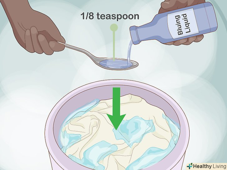Також ви можете використовувати синьку. вона складається з крохмалю, змішаного з будь-якої синьою фарбою, і діє, нейтралізуючи жовтизну невеликим відтінком синього- Синьку розчиніть в холодній воді в пропорціях, зазначених на упаковці. Вам знадобиться всього ¼ або 1/8 чайної ложки (в залежності від того, який режим прання ви використовуєте). [1]