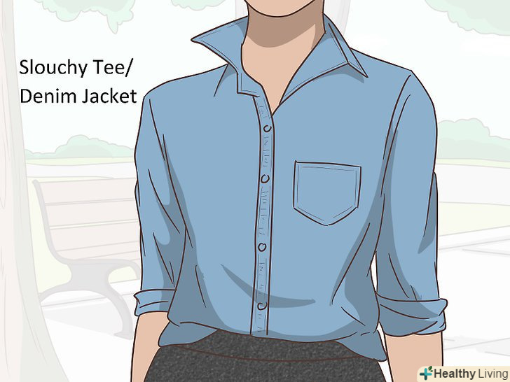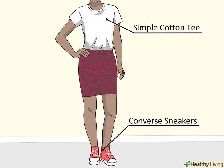 Зробіть спідницю менш помітною, доповнивши її просторою футболкою або джинсовим жакетом. щоб оксамит не був таким помітним, поєднуйте його з неформальними видами одягу, наприклад, з блузкою з сорочкової тканини, Простий футболкою або джинсовим жакетом. Базові речі вашого гардеробу додадуть простоту вашої спідниці і автоматично викреслять офіційний стиль з ансамблю. [6]