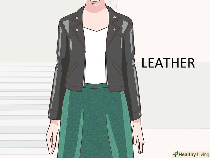 Залучіть на допомогу шкіряні речі. Доповнення оксамитової спідниці прямим шкіряним ременем або курткою в байкерському стилі відразу ж створить цікаве поєднання матеріалів різних текстур. Шкіра дозволить погасити формальний стиль оксамитової спідниці і зробить її більш придатною для якогось вечора. [10]- Якщо у вас немає шкіряного ременя або куртки, можна спробувати використовувати шкіряне кольє, браслет або сандалі.