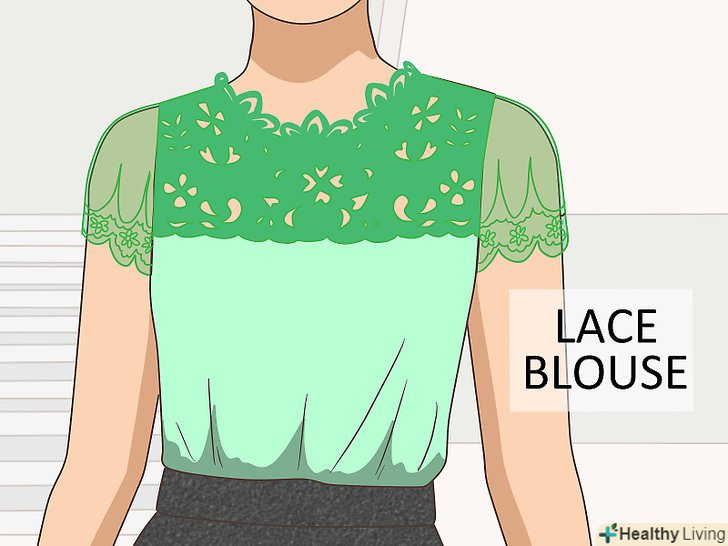 Додайте трохи більше жіночності за допомогою мережива. якщо ви хочете надати трохи більше жіночності своєму образу в оксамитовій спідниці, доповніть її мереживний блузкою або ажурними колготками. Мереживо дозволить представити в кращому світлі плюшевий зовнішній вигляд оксамиту, одночасно зробивши ваш наряд більш жіночним і привабливим.- Деякі люди побоюються носити мереживо. Якщо ви соромитеся надягати мереживну блузку або ажурні колготки, спробуйте замінити їх туфлями з мереживними деталями або яким-небудь мереживним аксесуаром для волосся.