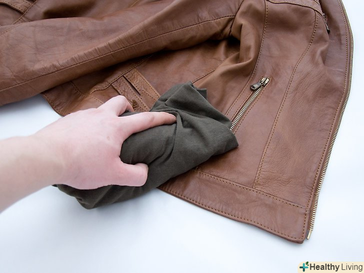 Протріть шкіру розведеним спиртом. Візьміть ганчірку і занурте її в суміш з 1 склянки (250 мілілітрів) денатурованого або ізопропілового спирту і 4 склянок (1 літра) води. Обережно протріть матеріал ганчіркою, щоб видалити залишилася цвіль. Не мочіть шкіру занадто сильно. Після цього почекайте, поки матеріал як слід висохне. [9]- Не забудьте, що необхідно використовувати розбавлений спирт, якщо ви впевнені, що у вас виріб з обробленої шкіри. Обов'язково перевірте дію спиртового розчину на крихітному ділянці матеріалу, перш ніж використовувати його для виведення всього плями. Водний розчин спирту може пошкодити навіть оброблену шкіру. [10]