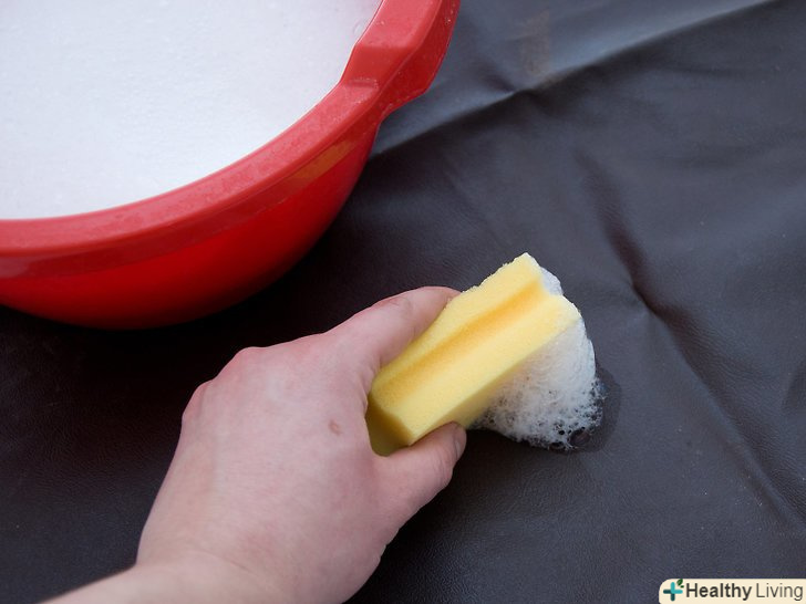 Обробіть матеріал милом. переконайтеся, що у вас виріб з обробленої шкіри, і її можна мочити. Оброблена шкіра має захисне покриття. Візьміть губку, рясно протріть пляму цвілі милом, а потім видаліть його вологою ганчіркою. [8]- Не мочіть шкіру занадто сильно, щоб не пошкодити її.