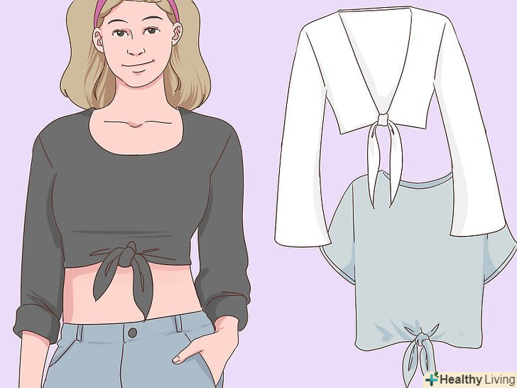 Для літнього, більш традиційного образу підберіть топ, що зав'язується спереду. Топ із зав'язками спереду дозволяє створити милий ретро-образ і оголює менше шкіри, ніж звичайний кроп-топ — відкритим залишиться лише невелику ділянку над штанами або спідницею. [6]- Також в топ із зав'язками спереду можна перетворити звичайну сорочку на ґудзиках, зав'язавши вузлом її поділ. Це відмінний спосіб звикнути до кроп-топу, оскільки ви можете зробити його як коротким, так і довгим.