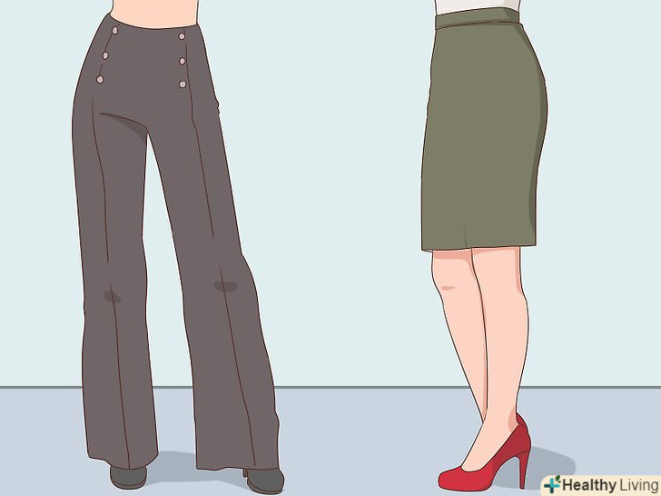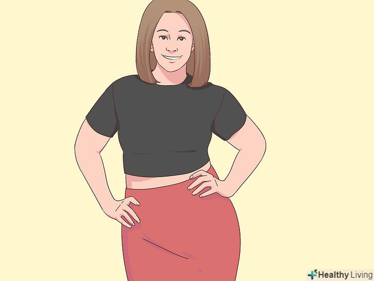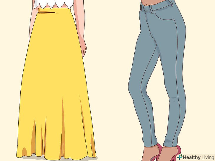 Одягніть довгу вільну спідницю або штани із завищеною талією. вільна спідниця максі або міді виглядає добре з коротким облягаючим кроп-топом. Підберіть спідницю, яка закінчується прямо над пупком на природній лінії талії. Вона виглядає добре на всіх типах фігури. Вільні штани із завищеною талією теж красиво виглядають з кроп-топом. [7]
