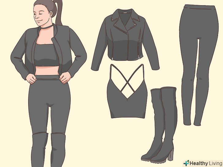 На побачення надіньте Темний облягаючий кроп-топ і низ. Чорний кроп-топ і темні легінси або джинси дозволять створити витончений образ, що ідеально підходить для побачення або вечірки. Підберіть під нього спортивну куртку на блискавці, щоб верхня частина тіла залишалася трохи менш відкритою, і високі чорні черевики. [9]