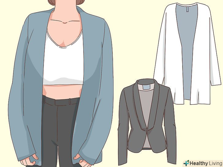 Виберіть довший структурований кроп-топ. пошукайте кроп-топ з вигадливими структурованими елементами, які не дуже щільно прилягають до тіла. Зав'язки спереду, комірці і плавний силует будуть підкреслювати достоїнства фігури, дозволяючи зберегти при цьому діловий характер. [10]