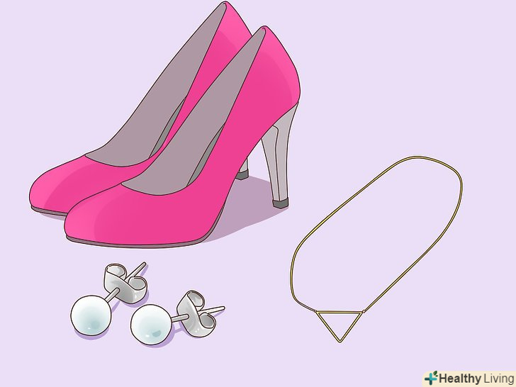 Зробіть образ більш святковим, додавши каблуки і прості прикраси. Кроп-топ виглядає трохи неформально, тому «облагородьте» його за допомогою взуття та аксесуарів. Каблуки-кращий варіант, але балетки з гострим носом також додадуть Вашому образу елегантності. Підберіть просте намисто і сережки-гвоздики, щоб додати трохи блиску. [12]