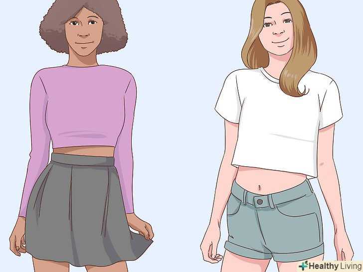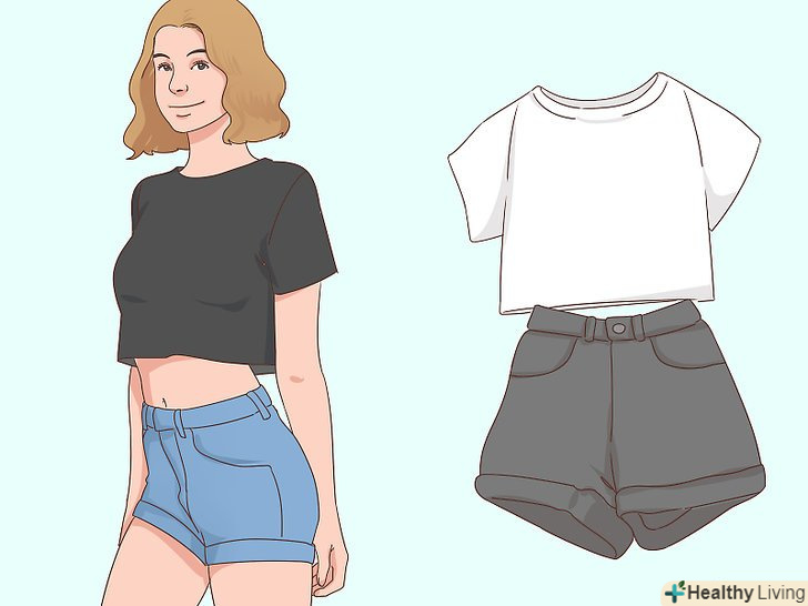 Для кокетливого пляжного образу надіньте топ і шорти із завищеною талією. вільний кроп-топ плавно лягає на область живота, а шорти виділяють талію в більш повсякденному образі, що підкреслює фігуру. Можна підкоригувати пояс шорт, в залежності від того, наскільки відкритою ви хочете залишити талію. Шорти із завищеною талією і вільний подовжений кроп-топ прикривають весь тулуб, а коротший топ і шорти із заниженою посадкою оголюють більше шкіри. [2]