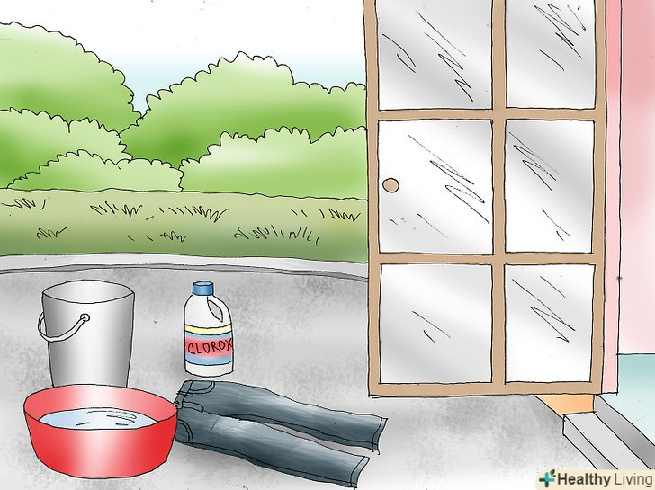 Візьміть ваш відбілювач, воду, відро, джинси і віднесіть в добре провітрюване приміщення. відбілювач є токсичною хімічною речовиною, яка не повинна надходити в організм і яку не слід вдихати в себе.