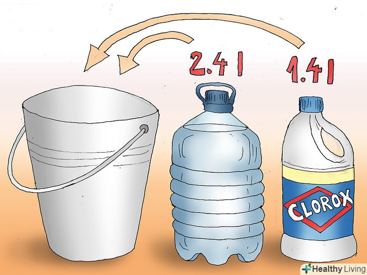 У відро залийте 2,4 літра води і 1,4 літра відбілювача.- Хоча збільшення кількості відбілювача і сприятиме більш швидкому фарбуванню, однак, це послабить вашу джинсову тканину. В результаті, в найнесподіваніших місцях можуть з'явитися дірки.