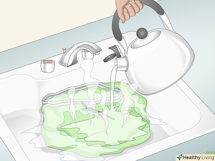 Змочіть спортивні штани гарячою водою. це можна зробити, використовуючи найгарячіший режим на пральній машині, або водою, нагрітою в чайнику. [16] якщо ви вирішили використовувати чайник, опустіть спортивні штани в раковину і вилийте на них гарячу воду, намагаючись не обпектися. Можливо, вам доведеться зробити це кілька разів, щоб повністю просочити штани.