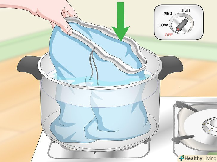 Акуратно опустіть спортивні штани в воду і вимкніть вогонь. Будьте обережні, щоб з каструлі не виплеснувся окріп і не потрапив вам на руки. [12]- Використовуйте дерев'яну ложку або довгі металеві щипці, щоб повністю занурити штани у воду.