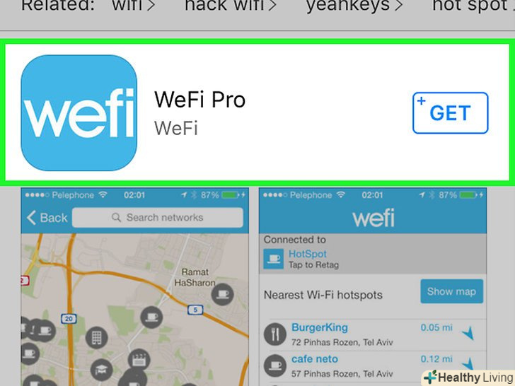 Знайдіть незахищену мережу. якщо ви перебуваєте в місті, але у вас немає можливості зайти в кафе або ресторан, спробуйте знайти незахищену (без пароля) мережу в списку доступних мереж на смартфоні або комп'ютері.- Користуйтеся незахищеною мережею з обережністю, оскільки будь-які дані, які передаються по такій мережі, можуть бути вкрадені.