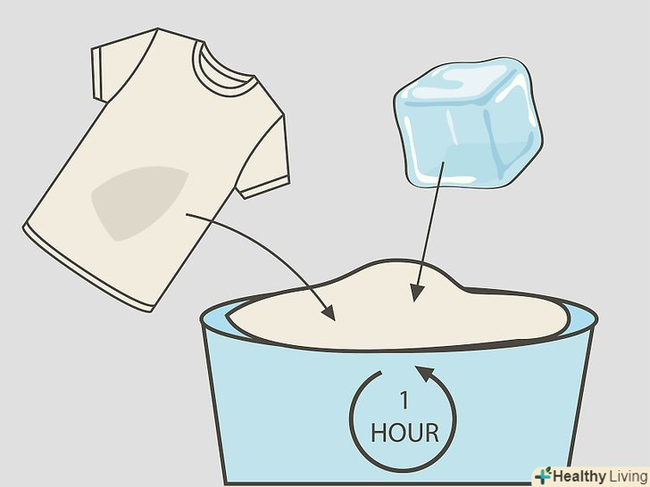Замочування в крижаній воді. деякі інтернет ресурси рекомендують перед застосуванням будь-яких інших способів обробити свіжопоставлені плями замочивши виріб в крижаній воді. [8] підтримуйте низьку температуру води, поки в ній замочено пошкоджене виріб, додавайте лід або ж помістіть весь контейнер в морозильну камеру. Для досягнення кращого результату залиште виріб в холодній воді як мінімум на годину.- Якщо ви скористалися цим способом і замочили річ в холодній воді і помістили контейнер в морозильну камеру, не забудьте вчасно дістати — хоч заморозка зазвичай і не псує тканину, але все ж може уповільнити процес виведення плям.