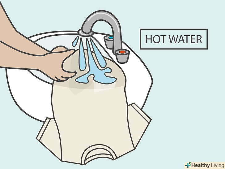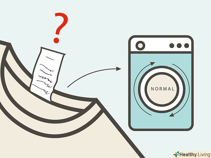 Прання. після завершення попередньої обробки тканини помістіть виріб в пральну машину і запустіть відповідний режим. Іншими словами, застосуйте режим прання відповідний вказівкам на ярлику. Також можете додати інші потребують прання речі, якщо встановлений режим і використовувані миючі засоби їм підходять.- Як було згадано вище, під час основного прання ви можете використовувати безпечні для тканини відбілювачі або інші чистячі засоби.