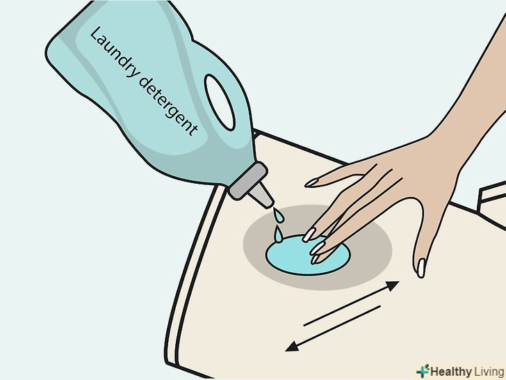 Нанесіть миючий засіб на пляму. пальцями акуратно втирайте пральний порошок в пляму залишене праскою. [1] залиште річ в такому стані на деякий час, це дозволить миючого засобу проникнути в пляму і посилить його дію перед тим, як ви випрали всю річ. На даному етапі не слід використовувати відбілювачі або інші спеціалізовані засоби для чищення— у вас ще буде можливість ними скористатися.- Рідкий миючий засіб є найбільш підходящим для цих цілей, так як воно може просочитися між тісно переплетеними волокнами тканини і усунути сліди опіку на мікроскопічному рівні. Проте, для даного завдання (як і для інших пов'язаних з плямовиведенням) ви можете використовувати порошковий засіб, попередньо змішавши його з невеликою кількістю води і утворивши м'яку пасту. [2]
