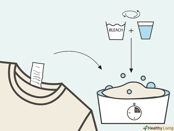 У деяких випадках застосовується замочування у воді з відбілювачем. якщо тканина даної речі, складається з матеріалів, до яких відбілювач безпечно застосуємо, ви можете здійснити більш глибоку підготовку виведення плям. Залиште річ на 15 хвилин в розчині з відбілювачем. Використовуйте один-два ковпачки відбілювача на кожні 5 літрів води. Для забезпечення рівномірного вбирання діючого засобу, час від часу слід помішувати розчин.- Якщо ви не впевнені, чи підходить тканина виробу для обробки відбілювачем, перевірте ярлик з інструкцією по догляду. Як правило, шерсть, шовк, мохер і тканини з нестійким забарвленням не підлягають обробці із застосуванням відбілювачів. [3]