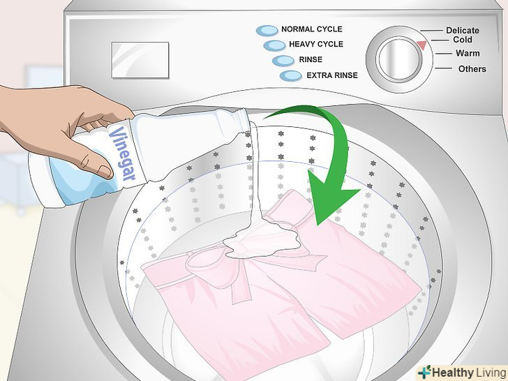 Налийте в пральну машину ½ склянки (120 мл) білого оцту. Якщо у вас машина з верхнім завантаженням, оцет можна налити безпосередньо в барабан. Якщо ваша машина має фронтальне завантаження, оцет можна налити в відсік для ополіскувача. Оцет розчинить будь-який осад від порошку і мінеральні відкладення, що утворилися через занадто жорсткою води, і ваш одяг стане яскравішим. [5]- Оцет можна використовувати не тільки для того, щоб усунути осад на тканині, але і щоб запобігти його утворенню на новому одязі. [6]