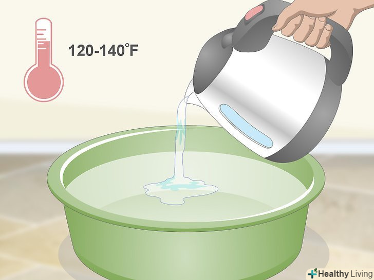 Налийте в ємність для фарбування воду температурою 50-60 °C. згідно з російськими нормативами, температура гарячої води в крані повинна бути 60-70 °C, тому якщо ви просто наберете нерозбавленої гарячої водопровідної води, її температура повинна бути достатньою для фарбування. Якщо для фарбування вам потрібна вода більш високої температури, підігрійте воду на плиті до закипання. Налийте воду у великий таз, відро або ванну або наповніть пральну машину з верхнім завантаженням, вибравши режим з найвищою температурою води. [12]- Вам знадобиться приблизно 10-11 л води на кожні 0,5 кг тканини.