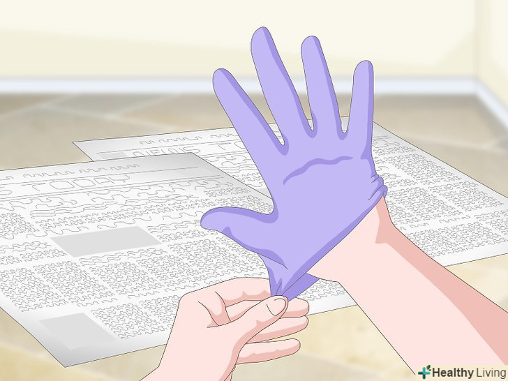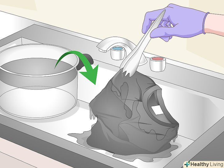 Захистіть від барвника шкіру рук і робоче місце, де ви будете займатися фарбуванням. застеліть місце, де ви плануєте працювати з барвником для тканини, газетами, плівкою або брезентом. Це допоможе захистити стіл і підлогу від бризок і плям фарби. Крім того, тримайте під рукою ганчірку або паперові рушники, щоб швидко витерти фарбу, якщо вона розіллється. Одягніть старий одяг, який не шкода забруднити, і щільні рукавички, щоб не забруднити руки. [10]- Слід працювати в гумових рукавичках, так як барвник, потрапивши на шкіру, може викликати роздратування. [11]