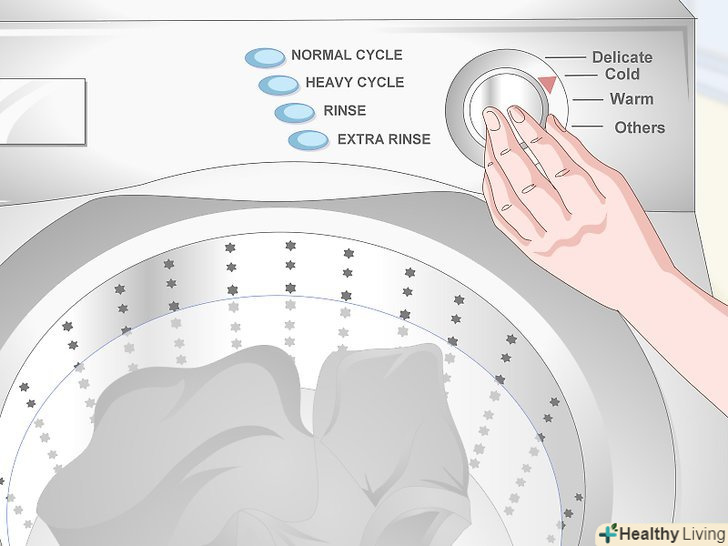 Виперіть одяг в прохолодній воді, вибравши стандартний цикл прання. покладіть вилиняли речі в пральну машину, додайте засіб для прання і запустіть машину. У більшості випадків замочування одягу в оцті з подальшим пранням буває досить, щоб колір тканини став яскравішим. [7]- Вибирайте цикл прання, який відповідає складу тканини вашої речі. Наприклад, якщо ви перете речі з тонких тканин, таких як шовк або мереживо, виберіть цикл дбайливого прання. Більш міцні тканини, такі як бавовна або денім, можна прати в стандартному режимі.