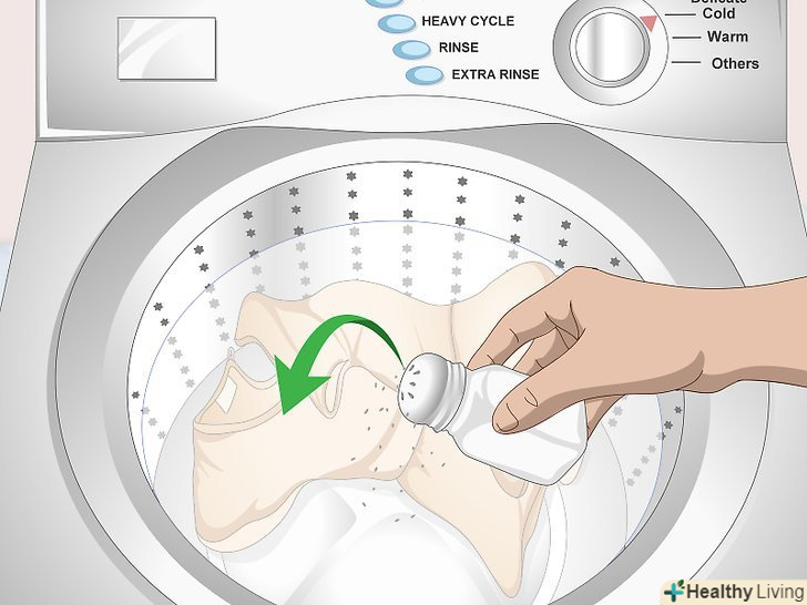 Покладіть речі в пральну машину і додайте звичайний засіб для прання. Якщо ваш одяг потьмяніла після декількох прань, винен може бути накопичився на поверхні тканини пральний порошок. Змити цей осад можна, додавши до звичайного циклу прання сіль, і ваш одяг буде виглядати як нова. [1]- Пральний порошок частіше залишає осад на одязі, ніж рідкий засіб для прання.