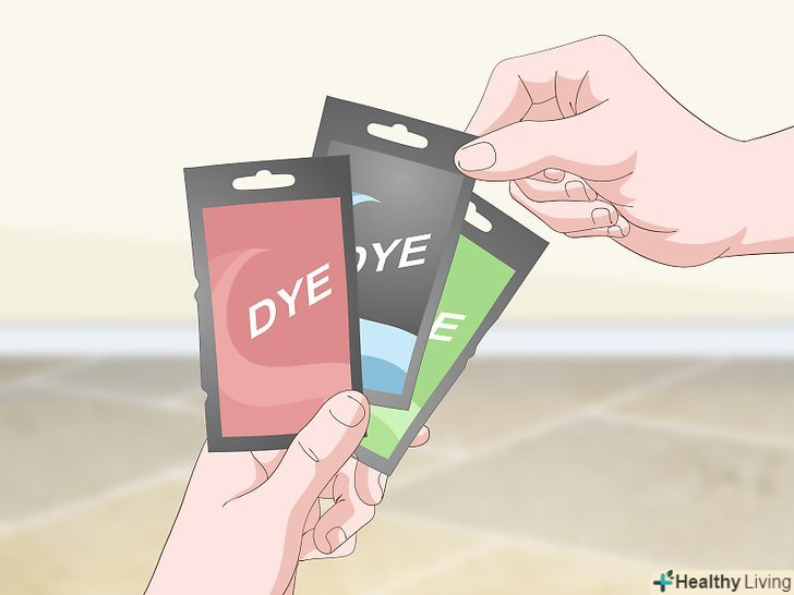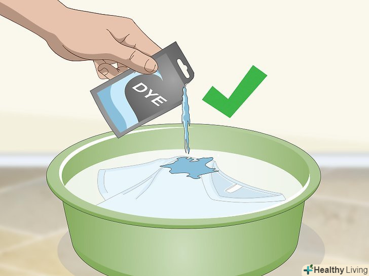 Підберіть барвник відтінку, найбільш близького до початкового кольору вашої речі. якщо ви хочете, щоб річ виглядала як нова, візьміть її з собою в магазин, коли підете купувати барвник. Постарайтеся підібрати барвник такого відтінку, який найближче до початкового кольору вашої речі. При фарбуванні він дасть найяскравіший і природний колір. [9]- Якщо ви хочете пофарбувати річ в інший колір , вам спочатку доведеться знебарвити тканину.