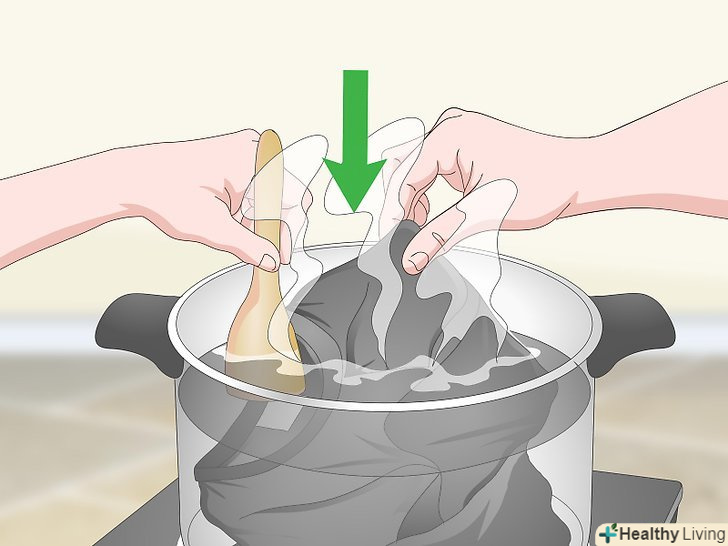 Замочіть одяг у розчині барвника на 30-60 хвилин, регулярно помішуючи. покладіть одяг в ємність з розчином барвника. Повністю занурте одяг в розчин за допомогою довгої ложки або щипців. Щоб тканина просочилася барвником рівномірно, помішуйте одяг кожні 5-10 хвилин. Постарайтеся розправити всі складки і зморшки, щоб барвник в них не застоювався. [16]- Чим інтенсивніше ви будете помішувати речі в розчині, тим рівномірніше фарба ляже на тканину. Можна заважати розчин не перестаючи або перемішувати з періодичністю кожні кілька хвилин.