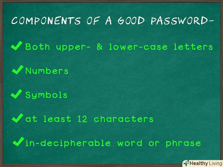 Вивчіть складові хорошого пароля. якщо ви внесете всі наступні компоненти в свій пароль, його буде дуже складно зламати: [2]- Знаки і верхнього, і нижнього реєстру (заголовні і рядкові);