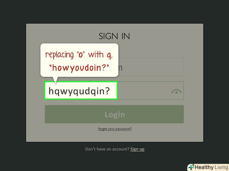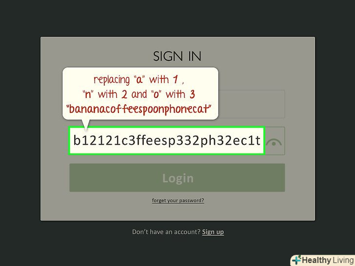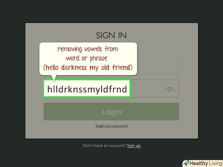 Візьміть до уваги поширені стратегії паролів.якщо у вас немає власного методу для створення запам'ятовується пароля, спробуйте виконати одну з наступних дій:- Видаліть голосні зі слів або фраз (наприклад, «канікули в Простоквашино» стане «кнклвпрстквшн»).