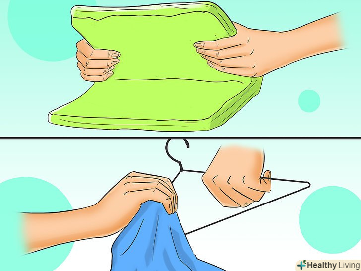 З сильно мнуться речами розберіться відразу ж, як сушка завершена, щоб вони не пом'ялися[7] . це означає, що потрібно або повісити їх на вішалки, або скласти відповідним чином. Якщо відразу скласти штани і шорти, то купа, яку вам треба буде нести назад, стане менше. Якщо відразу після сушіння ви складіть джинси і штани так, як зазвичай прасуйте (рівні спереду або зі стрілкою посередині) то, ймовірно, вам не доведеться їх гладити в подальшому (в залежності від складу тканини).