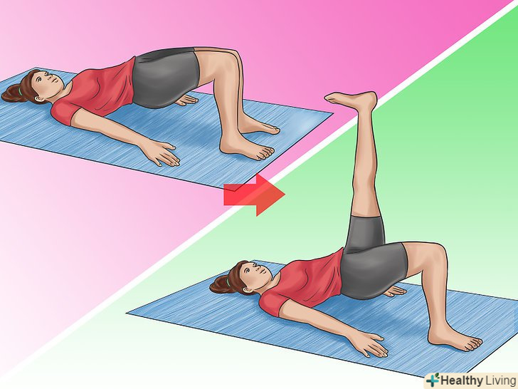 Спробуйте зробити місток з підйомом ніг. ця вправа допоможе зміцнити попу, сухожилля і поперек. Для початку ляжте спиною на підлогу. Зігніть коліна, міцно впираючись ногами в підлогу, руки залиште лежати уздовж тулуба. Відірвіть стегна від підлоги, при цьому напружуючи прес. [9]- Підніміть праву ногу і випряміть її. Утримуйтеся в цій позиції 3 секунди, потім поверніть ногу на підлогу.