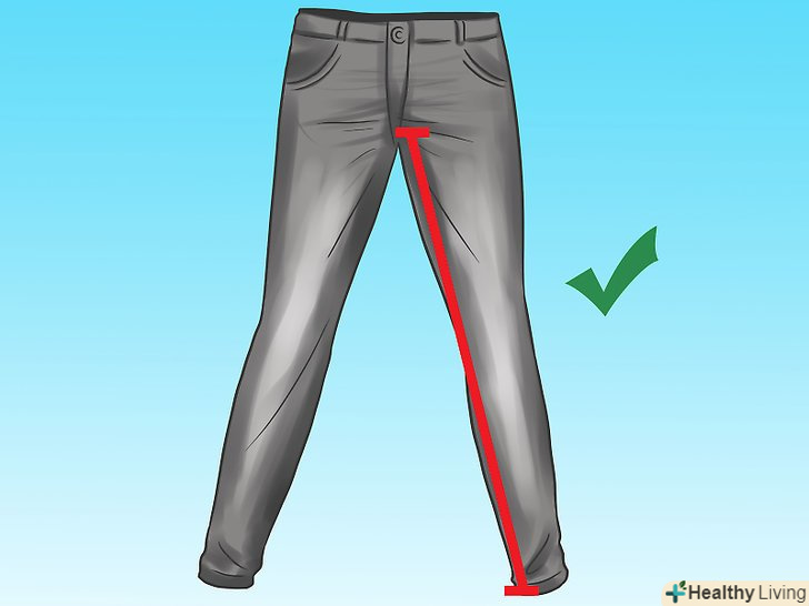 Підберіть правильний внутрішній шов. внутрішній шов — це довжина брюк від клин крокового шва до самого низу. Якщо внутрішній шов занадто довгий, джинси не будуть сидіти як треба. Можна виміряти внутрішній шов будинку, взявши пару штанів, які вам добре підходять, відміряти відстань від низу застібки-блискавки до кромки штанів. [13]- Якщо ви знайшли пару штанів, які скрізь добре сидять, але занадто довгі, віднесіть їх в ательє, щоб вкоротити.