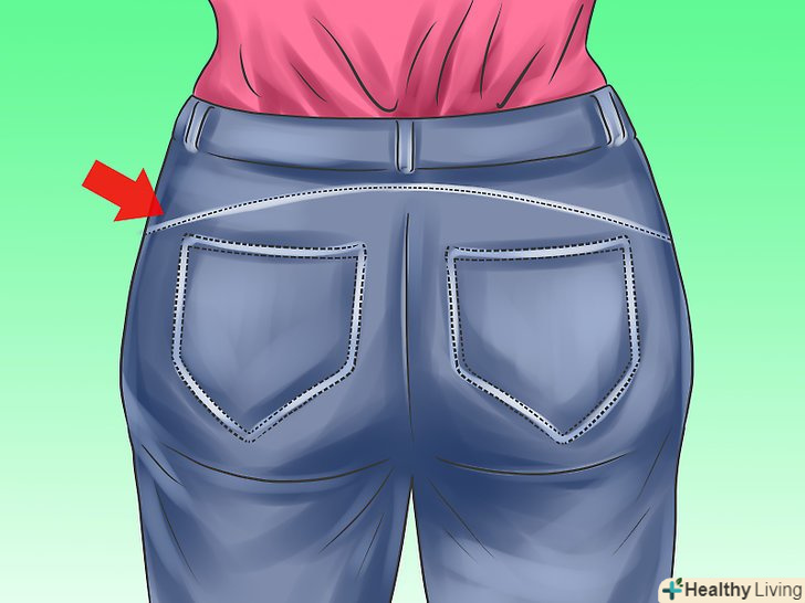 Зверніть увагу на кокетку джинсів. Кокетка-це шов, який розташований нижче пояса, але вище задніх кишень. Пошукайте кокетку, яка знаходиться недалеко від верху вашої попи, на кілька сантиметрів нижче попереку. [14]- Щоб попа виглядала кругліше, шукайте кокетку, вигнуту вгору.