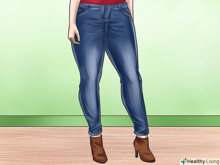Купіть злегка розкльошені джинси. це найоптимальніший стиль, який чудово виглядає майже на кожній фігурі. Розкльошені джинси лягають по стегнах, трохи звужуючись в колінах і злегка розширюючись внизу. [1]- Злегка розкльошені джинси дозволяють продемонструвати вигини тіла, а також допомагають врівноважити стегна.