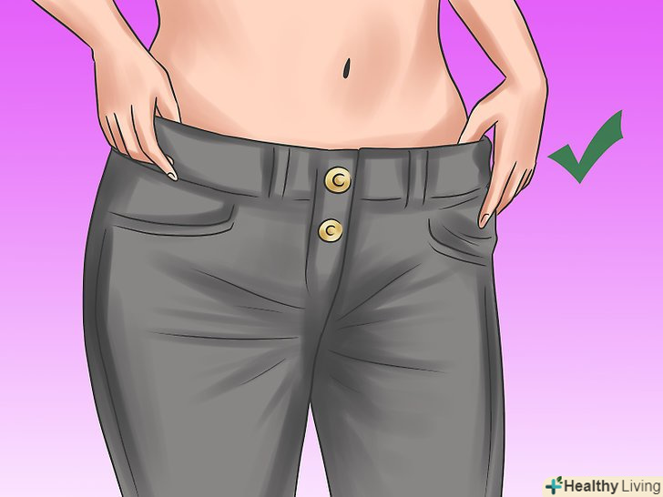 Підберіть правильну посадку. існує безліч фасонів джинсів, але універсальною і найбільш оптимальною посадкою є середня. Пошукайте джинси, які сидять на кілька сантиметрів вище тазової кістки, але нижче пупка. [3]- Джинси з низькою посадкою нерідко тиснуть на живіт, внаслідок чого жир збирається в складки над талією.