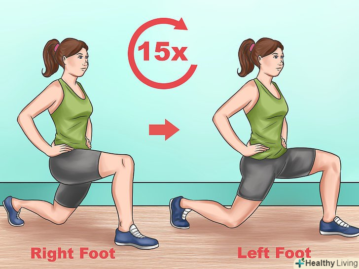 Робіть випади. випади дозволяють опрацювати сідниці, стегна і м'язи кора. Це відмінний спосіб зробити нижню половину тіла сильніше і більш підтягнутою. Для початку встаньте прямо, ноги разом, руки на стегнах. [7]- Зробіть крок вперед правою ногою і опускайте тіло до тих пір, поки ліве коліно не буде в 2 см від землі, а праве стегно — паралельно підлозі.