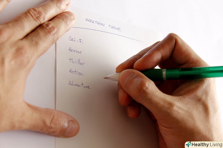 Підберіть тематику.популярними жанрами для кіно-марафонів є "чикфлік" (фільми для жінок), фільми жахів або комедії. Якщо немає бажання зупинятися на одному жанрі, підберіть ваші улюблені фільми.