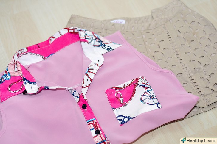 Після повернення додому викладіть весь одяг, який ви думаєте носити. виберіть сорочку. Скажімо, яскраво-рожевого кольору. Потім знайдіть пару шортів або джинсів. Якщо ви одягаєте шорти, візьміть по можливості не джинсовий варіант. Спробуйте натомість модель з іншого матеріалу.