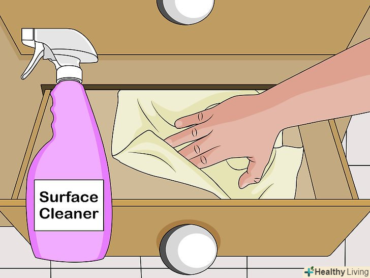 Вимийте висувні ящики і шафи. дістаньте з них весь одяг. Візьміть засіб для очищення поверхонь, м'який засіб для миття посуду або рідина для прання. Замочіть ганчірку в засобі і все нею протріть. Окремо виперіть одяг, перш ніж повернути її на місце в шафу. [11]
